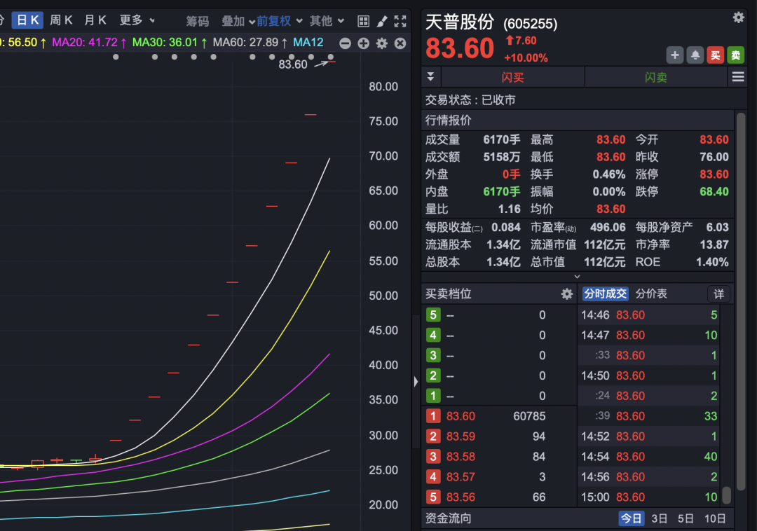 二次停牌核查复牌首日,天普股份(605255)再度一字涨停。该股自2025年8月22日以来已连续12个交易日涨停,累计上涨213.81%,最新报收83.6元/股,市值112亿元。